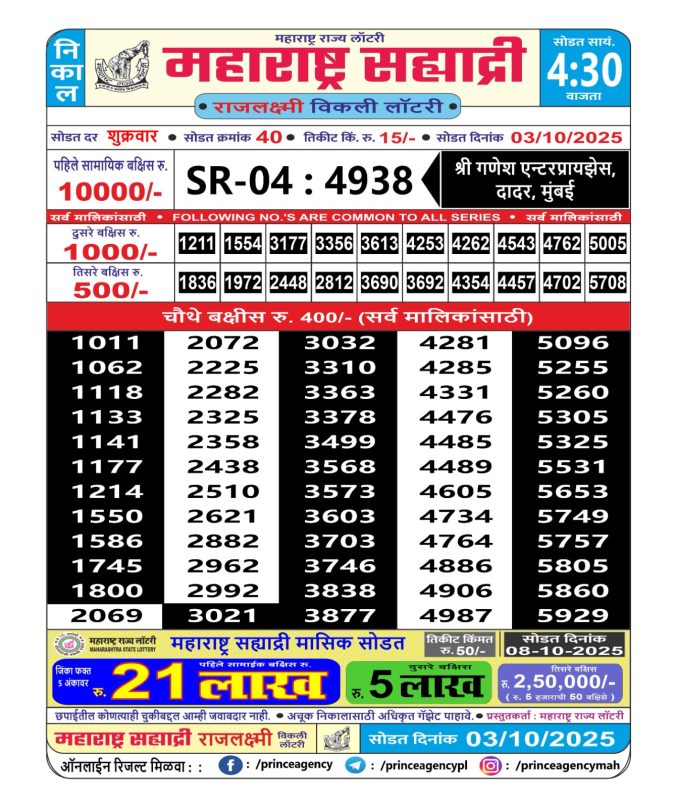 Maharashtra Sahyadri Weekly Lottery 4.30 PM Result 03.10.2025