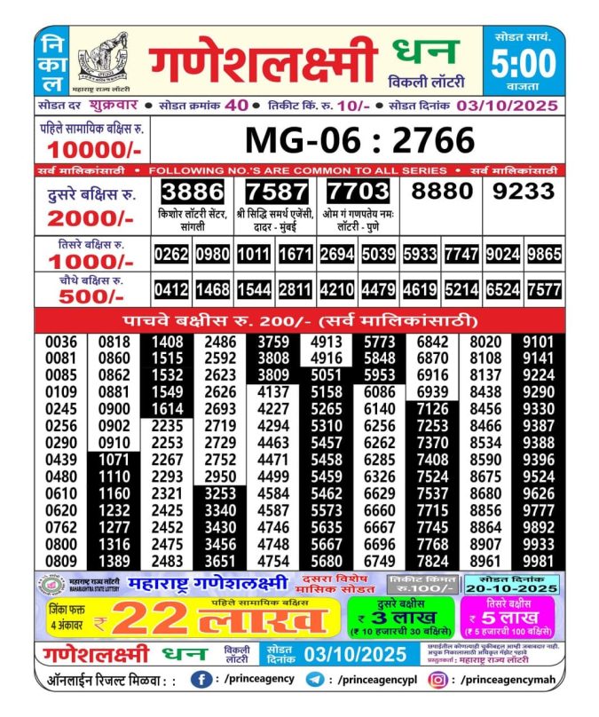 Maharashtra Ganeshlaxmi Weekly Lottery 5 PM Result 03.10.2025
