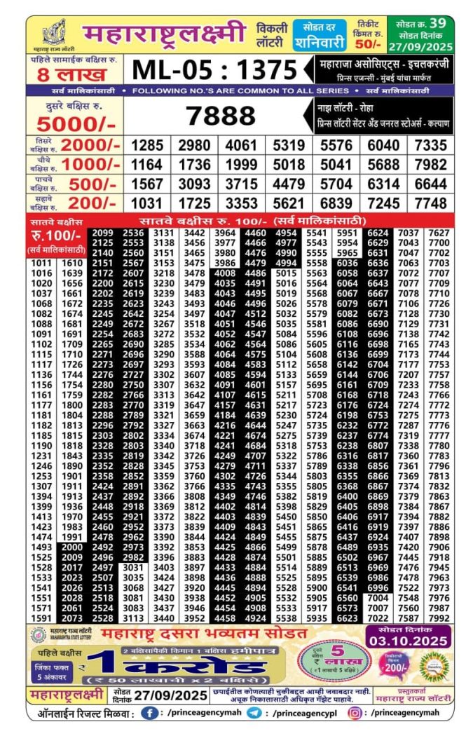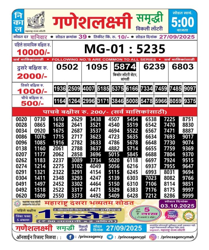 Maharashtra Ganeshlaxmi Weekly Lottery 5 PM Result 27.09.2025