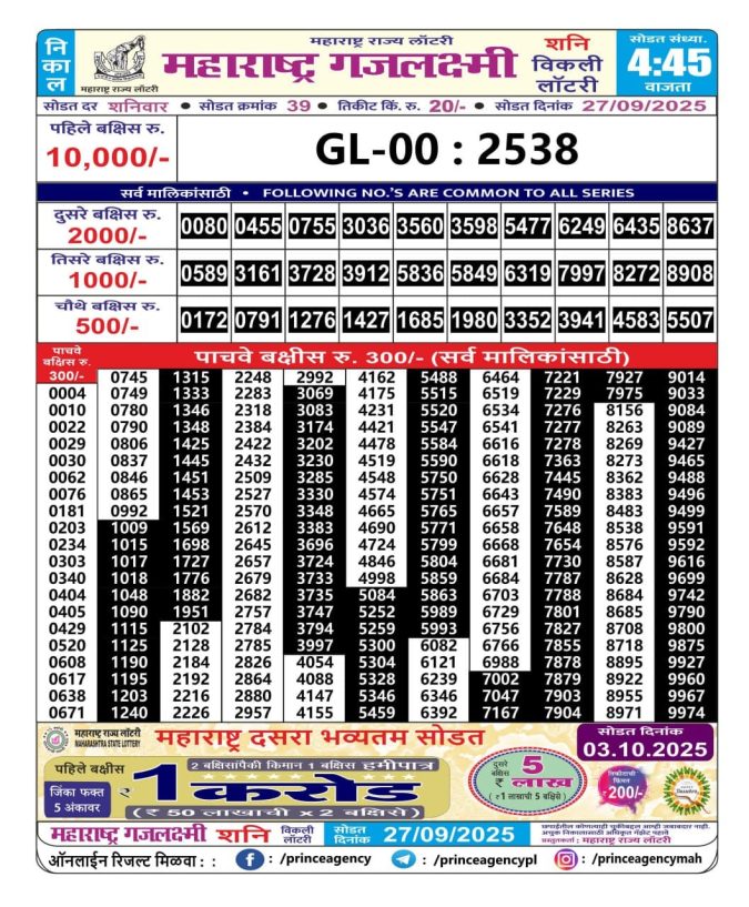 Maharashtra Gajlaxmi Weekly Lottery 4.45 PM Result 27.09.2025