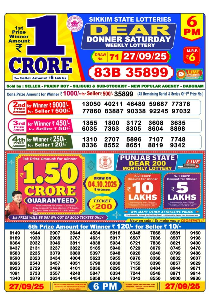 Dear Donner Saturday Weekly Lottery 6 PM Result 27.09.2025