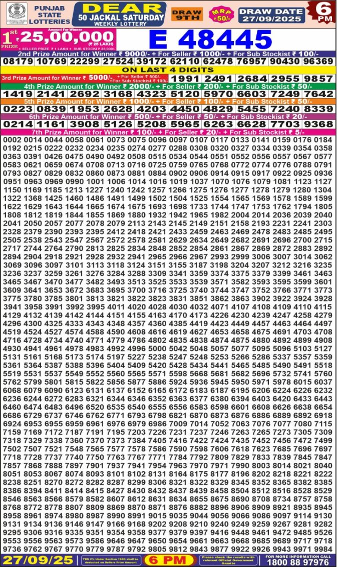 Punjab State Dear 50 jackal Saturday Weekly Lottery 6 pm Result 27.09.2025
