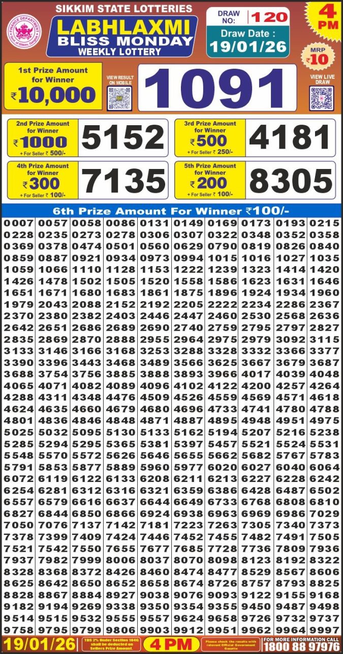 Labh Laxmi Bliss Monday Weekly Lottery 4 PM Result 18.01.2026