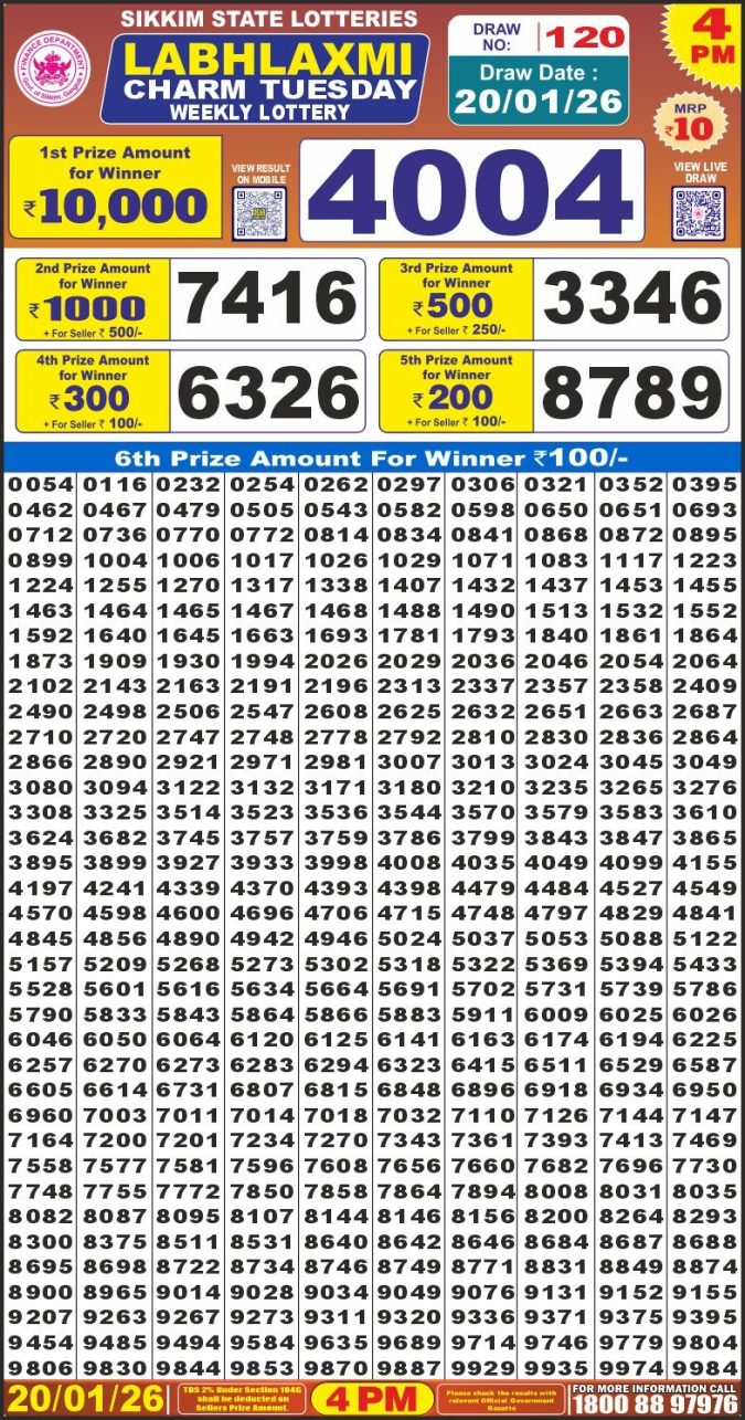 Labh Laxmi Charm Tuesday Weekly Lottery 4 PM Result 20.01.2026
