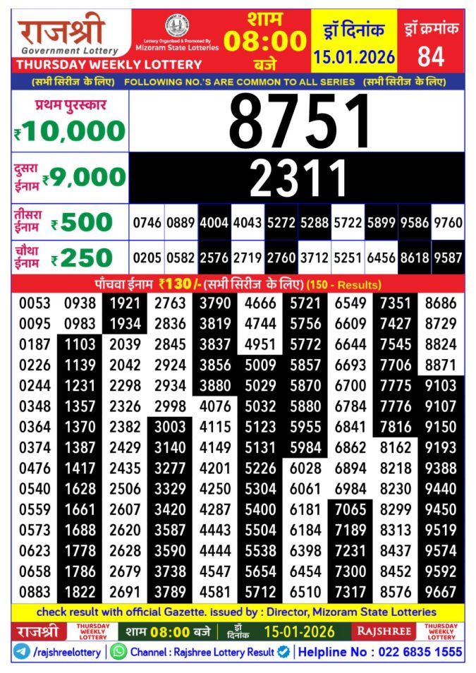 Rajshree Thursday Weekly Lottery 8 PM Result 15.01.2026