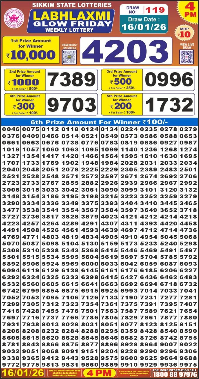 Labh Laxmi Glow Friday Weekly Lottery 4 PM Result 16.01.2026