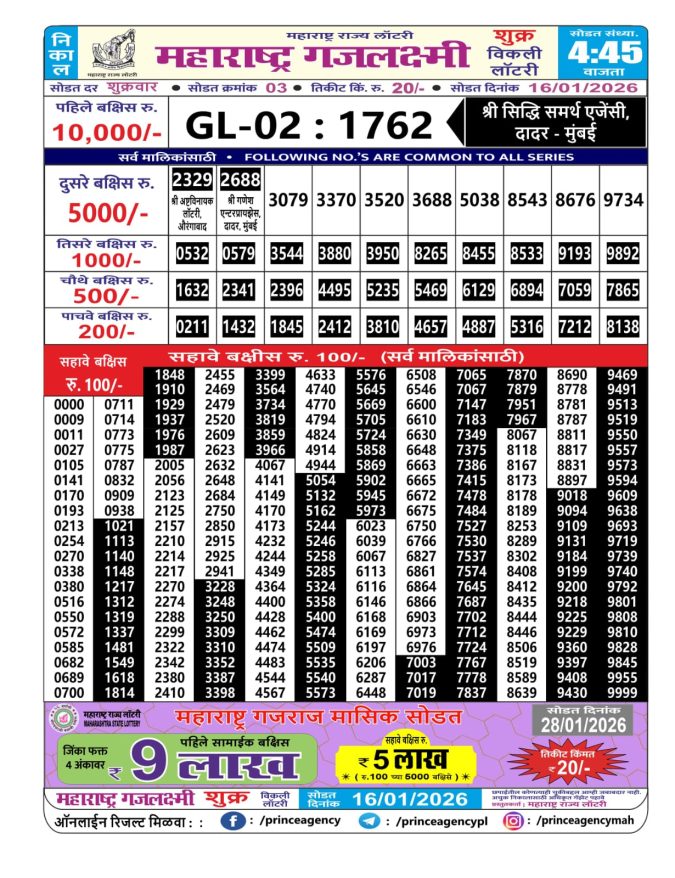 Maharashtra Gajlaxmi Weekly Lottery Result 16.01.2026