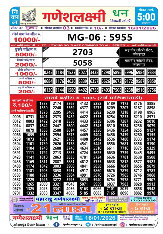 Maharashtra Ganeshlaxmi  Lottery Result 16.01.2026