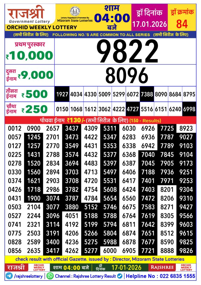 Rajshree Orchid Weekly Lottery 4 PM Result 17.01.2026
