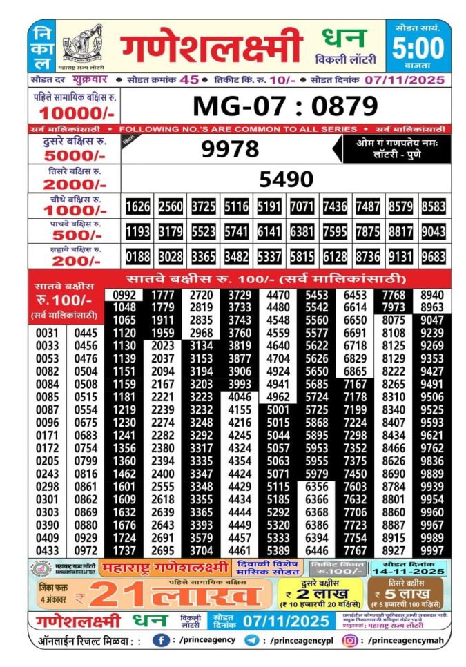 Maharashtra Ganeshlaxmi Weekly Lottery  Result 07.11.2025
