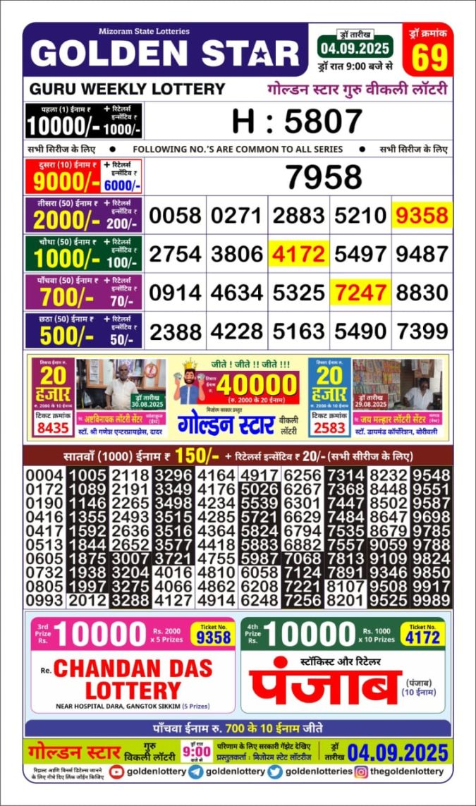 Golden Star Mangal Weekly Lottery 9 PM Result 04.09.2025