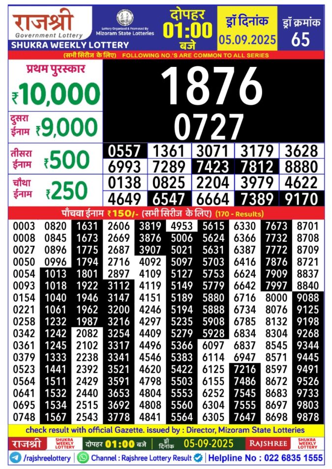 Rajshree Shukra Weekly Lottery 1 PM Result 05.09.2025