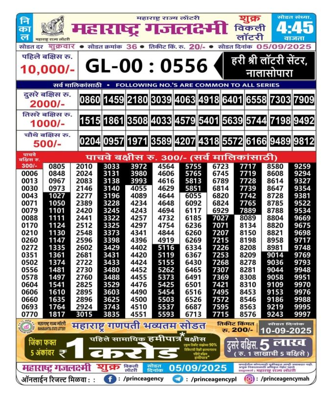 Maharashtra Gajlaxmi Weekly Lottery 4.45 PM Result 05.09.2025