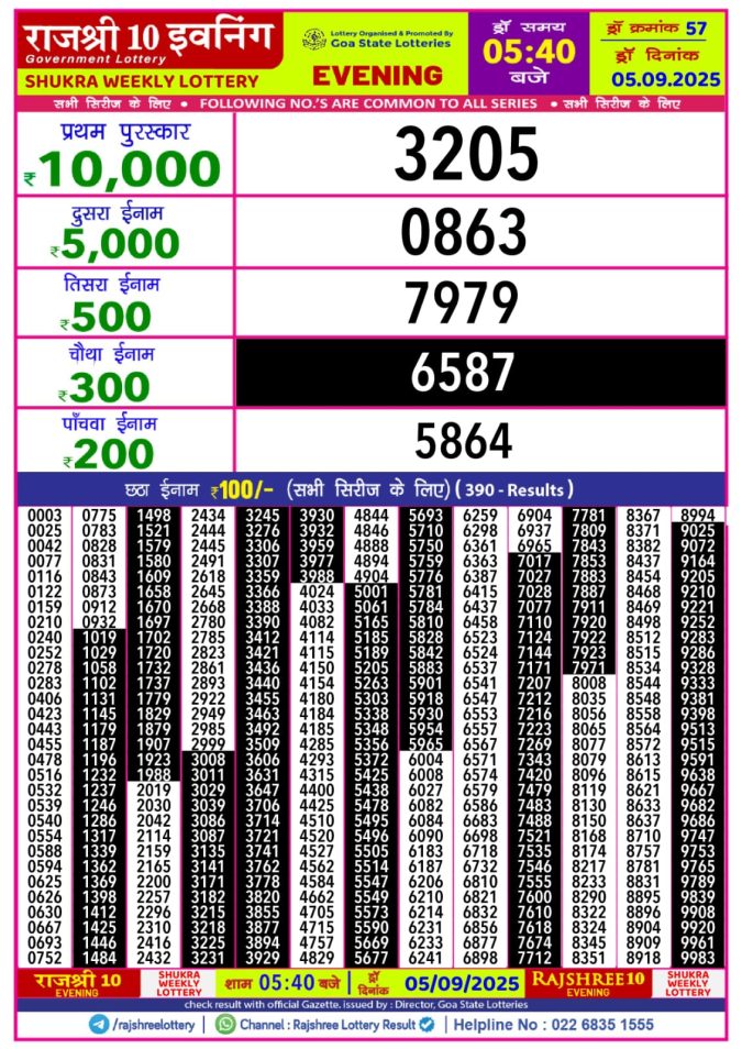 Rajshree 10 Evening Weekly Lottery 5:40 PM Result 05.09.2025