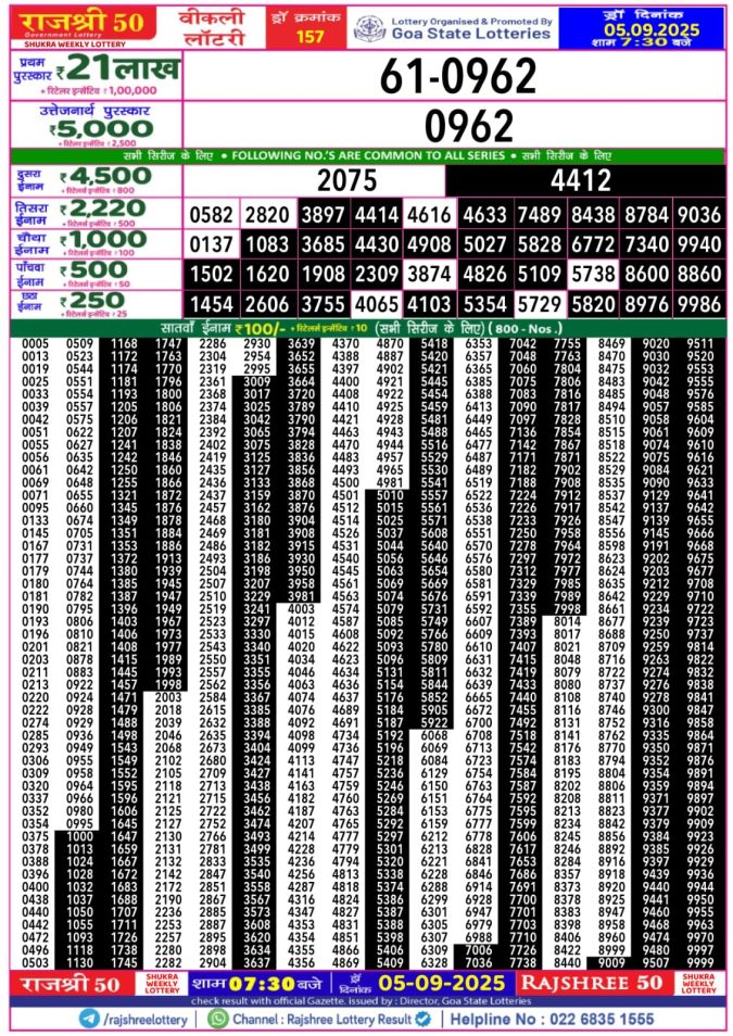 Rajshree 50 Shukra Weekly Lottery 7:30 PM Result 05.09.2025