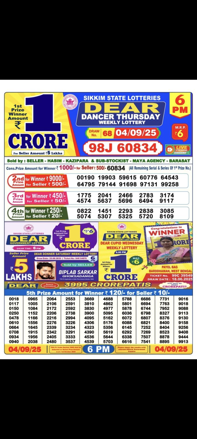 Dear Dancer Thursday Weekly Lottery 6 PM Result 04.09.2025