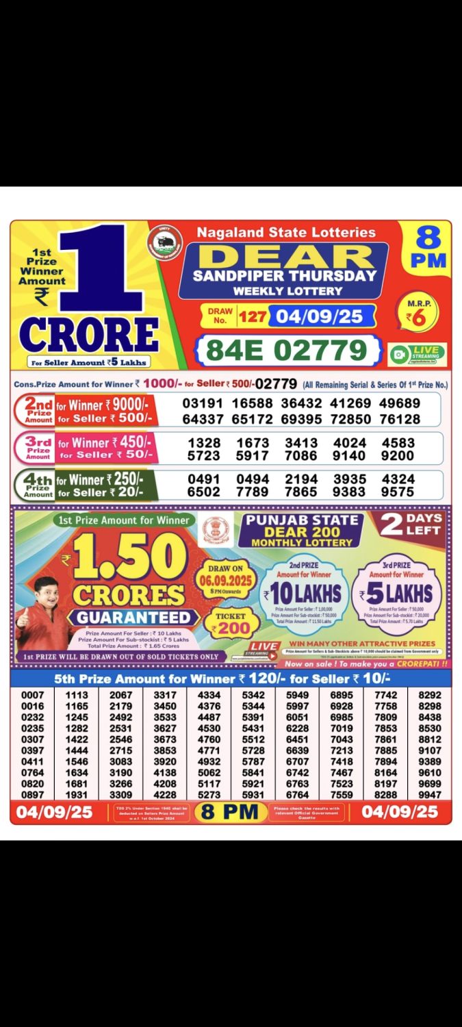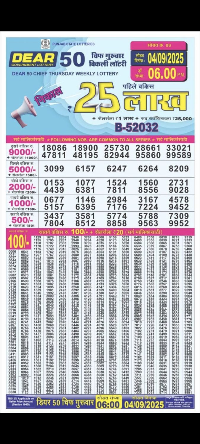 Punjab State Dear 50 chief Thursday Weekly Lottery 6 pm Result 04.09.2025