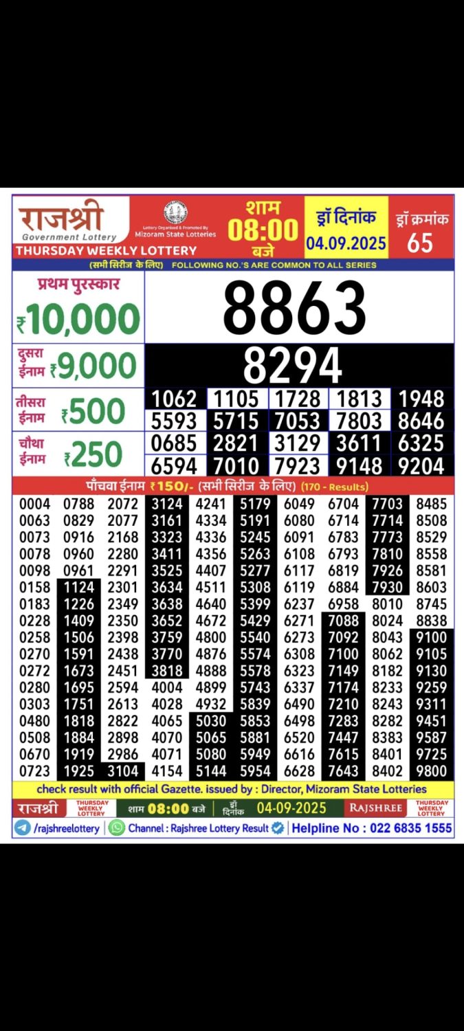Rajshree Thursday Weekly Lottery 8 PM Result 04.09.2025