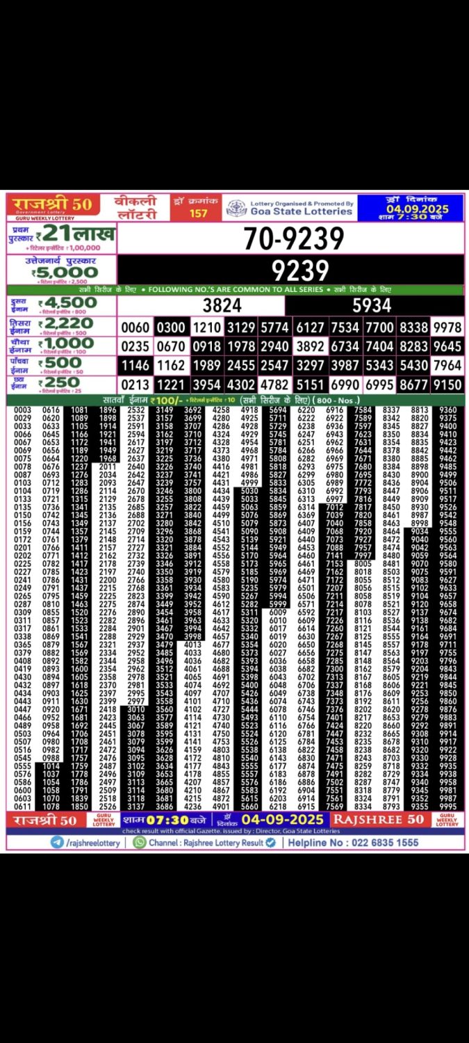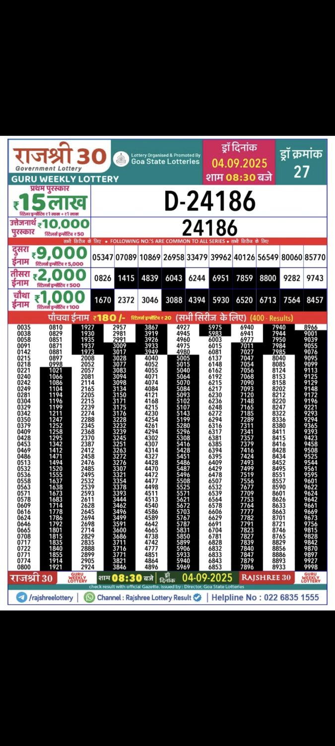 Rajshree 30 Guru Weekly Lottery 8:30 PM Result 04.09.2025
