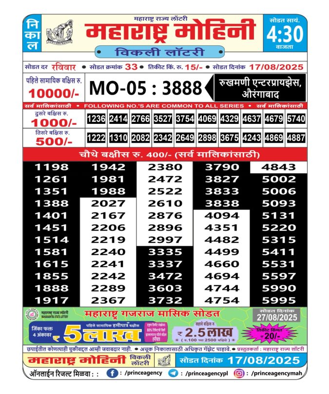 Maharashtra Mohini Weekly Lottery 4.30 PM Result 17.08.2025