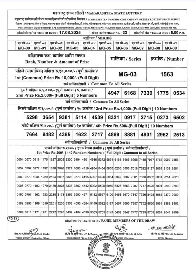 Maharashtra Ganeshlaxmi Weekly Lottery 5 PM Result 17.08.2025