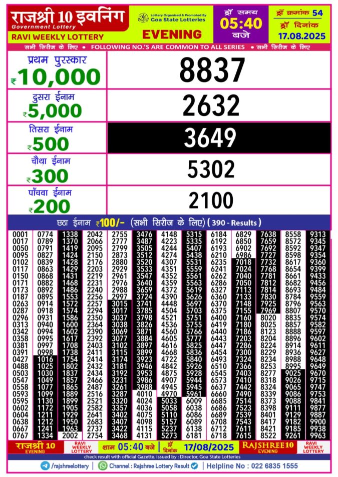 Rajshree 30 Ravi Weekly Lottery 8:30 PM 17.08.2025