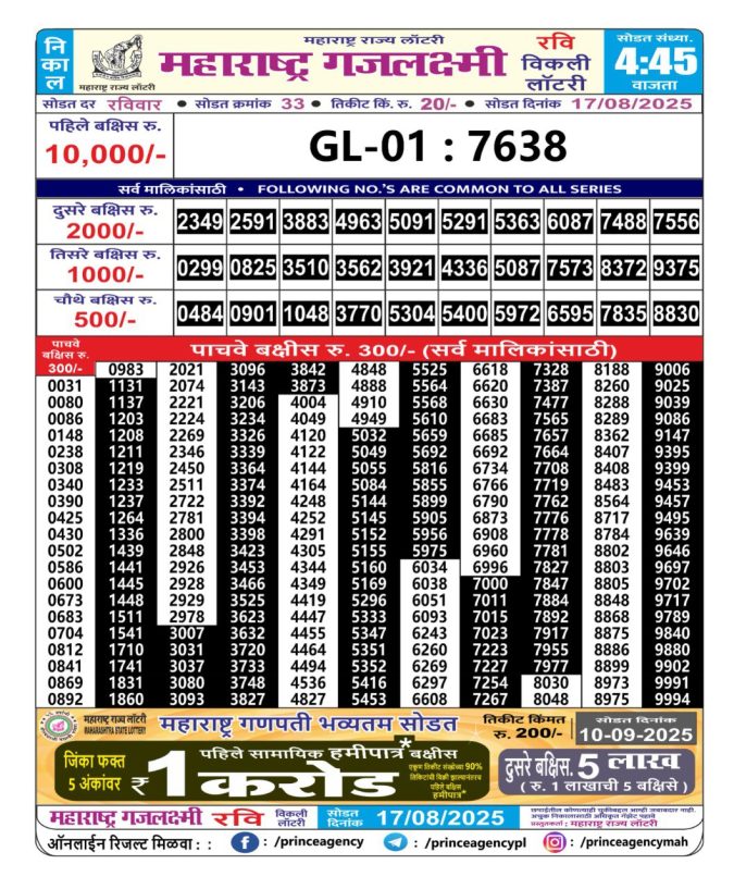 Maharashtra Gajlaxmi Weekly Lottery 4.45 PM Result 17.08.2025
