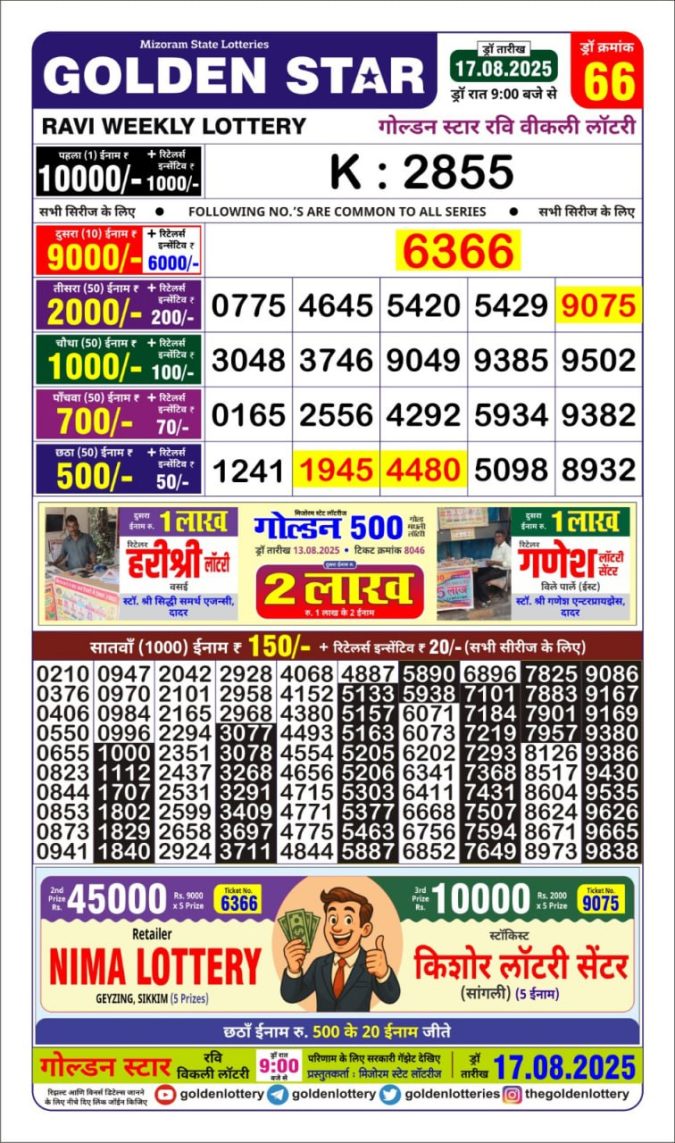 Golden Ravi shani Weekly Lottery 9 PM Result 17.08.2025
