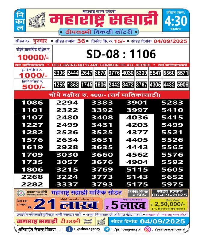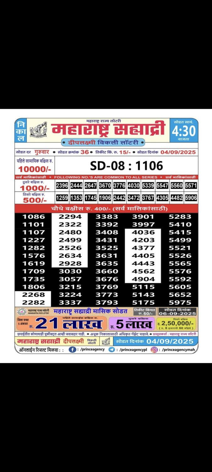 Maharashtra Sahyadri Weekly Lottery 4.30 PM Result 04.09.2025