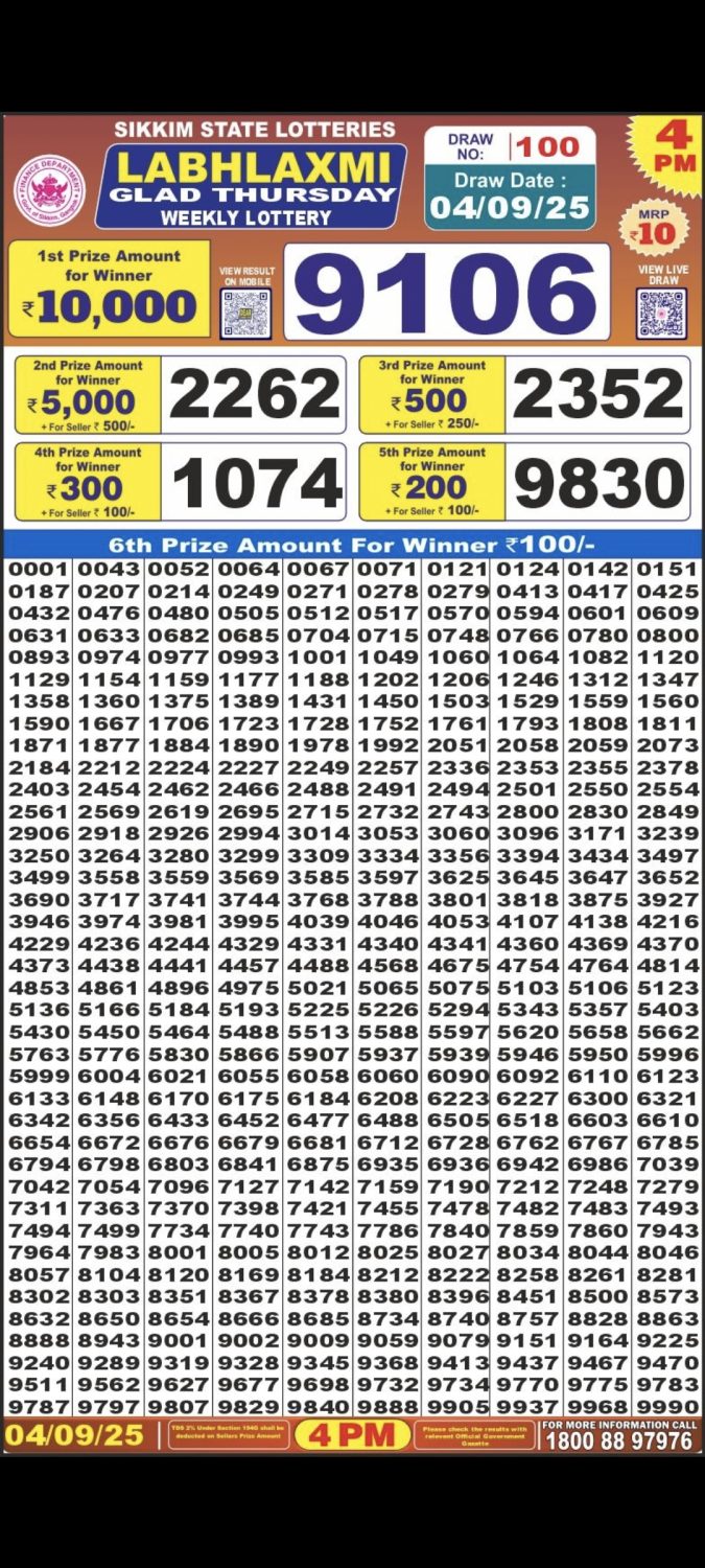 Labh Laxmi Glad Thursday Weekly Lottery 4 PM Result 04.09.2025