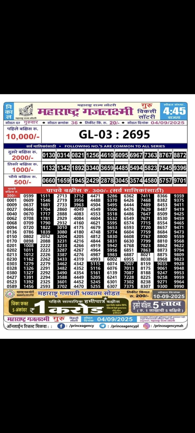 Maharashtra Gajlaxmi Weekly Lottery 4.45 PM Result 04.09.2025