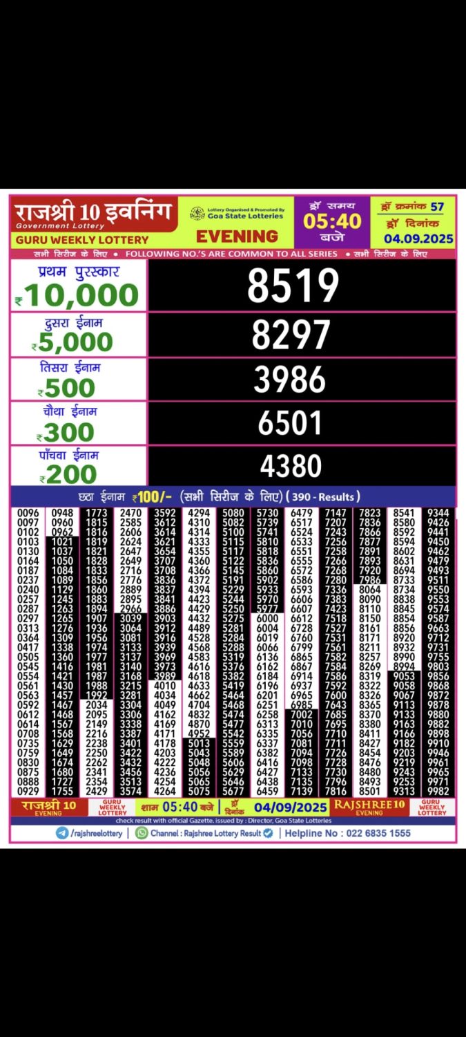 Rajshree 10 Evening Weekly Lottery 5:40 PM Result 04.09.2025