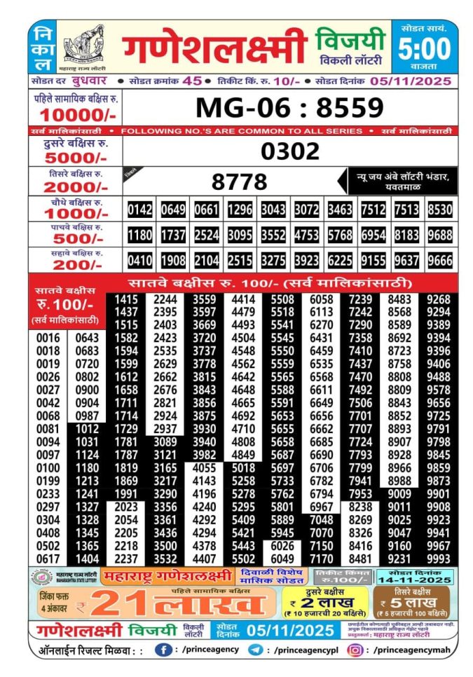 Maharashtra Ganeshlaxmi Weekly Lottery 5 PM Result 06.11.2025