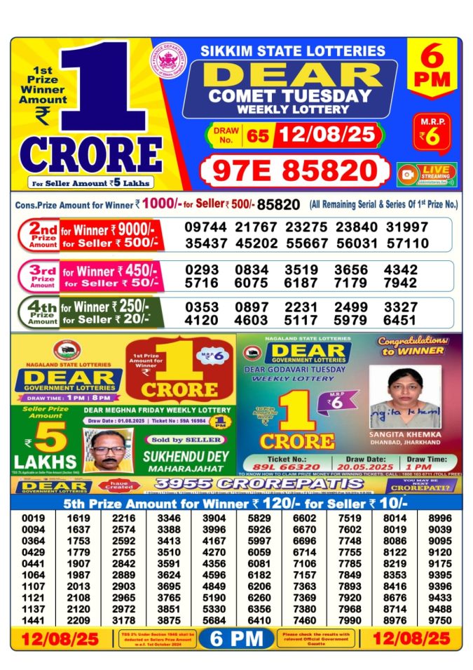Dear Comet Tuesday Weekly Lottery 6 PM Result 12.08.2025