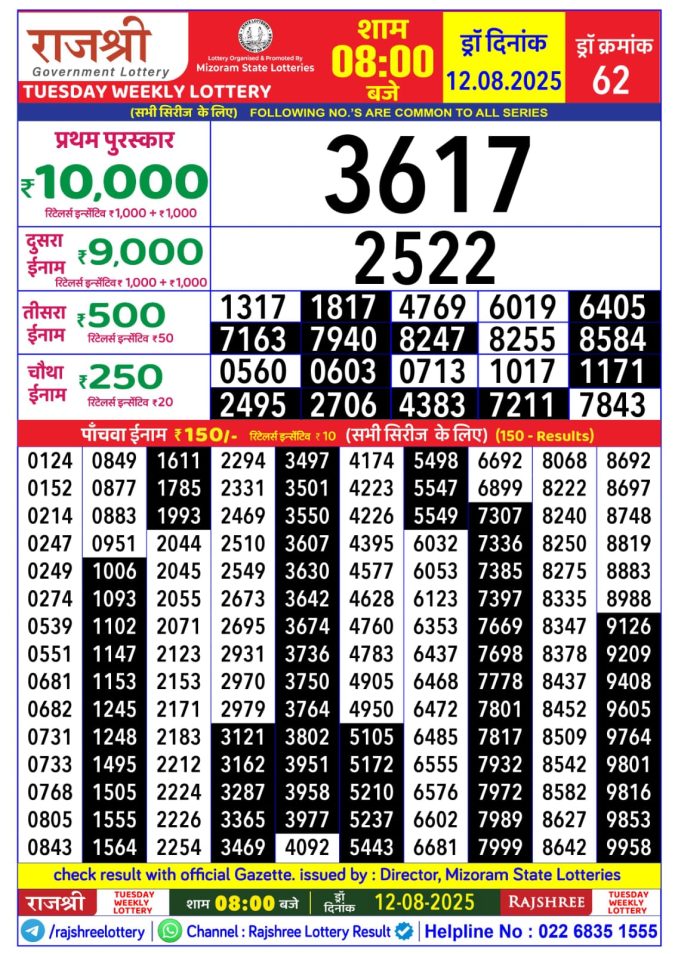 Rajshree Tuesday Weekly Lottery 8 PM Result 12.08.2025