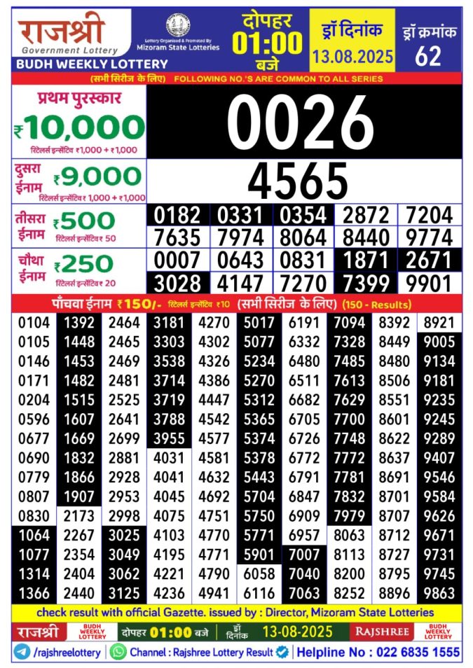 Rajshree Budh Weekly Lottery 1 PM Result 13.08.2025