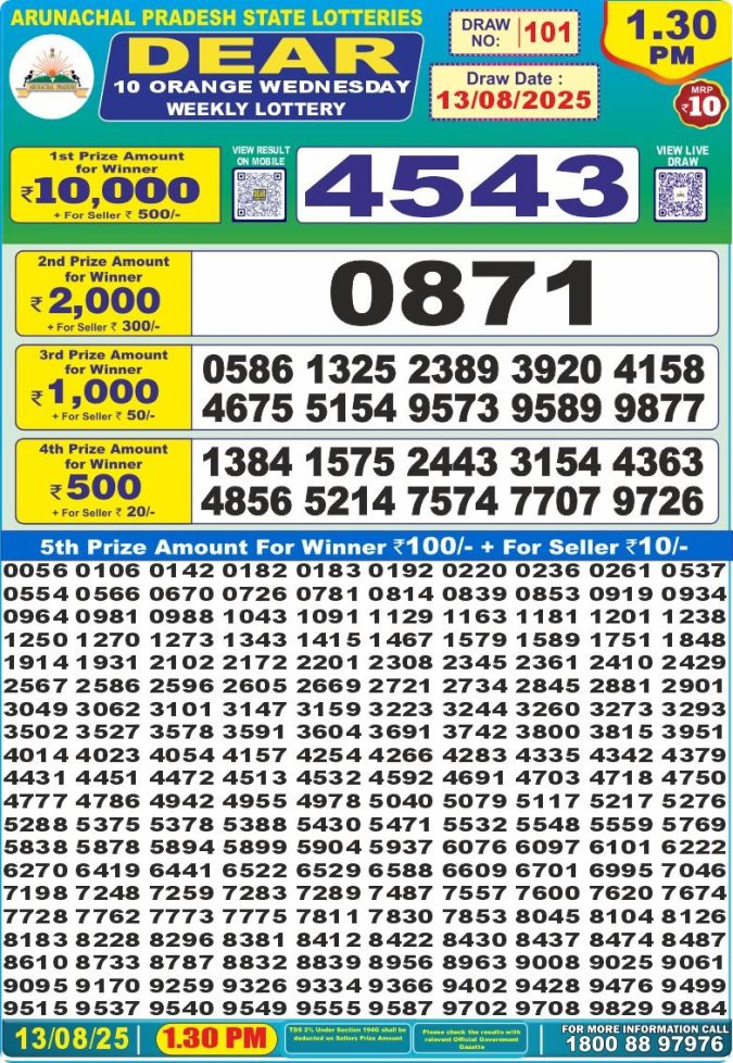 Dear 10 Orange Wednesday Weekly Lottery 1:30 PM Result 13.08.2025