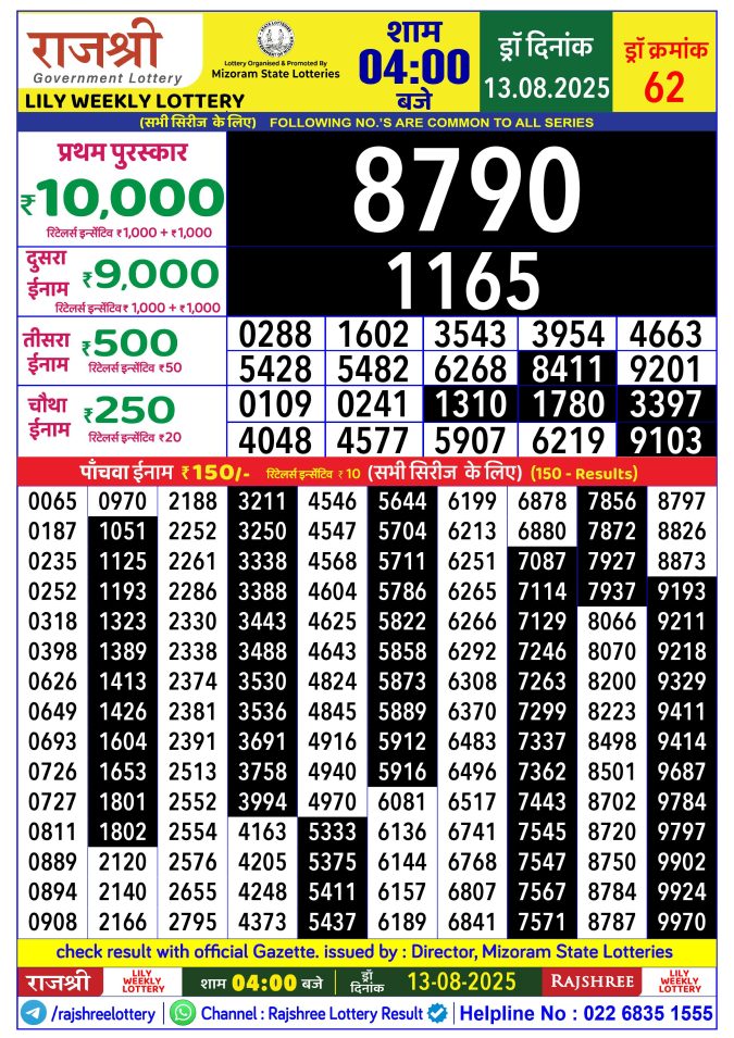 Rajshree Lily Weekly Lottery 4 PM Result 13.08.2025