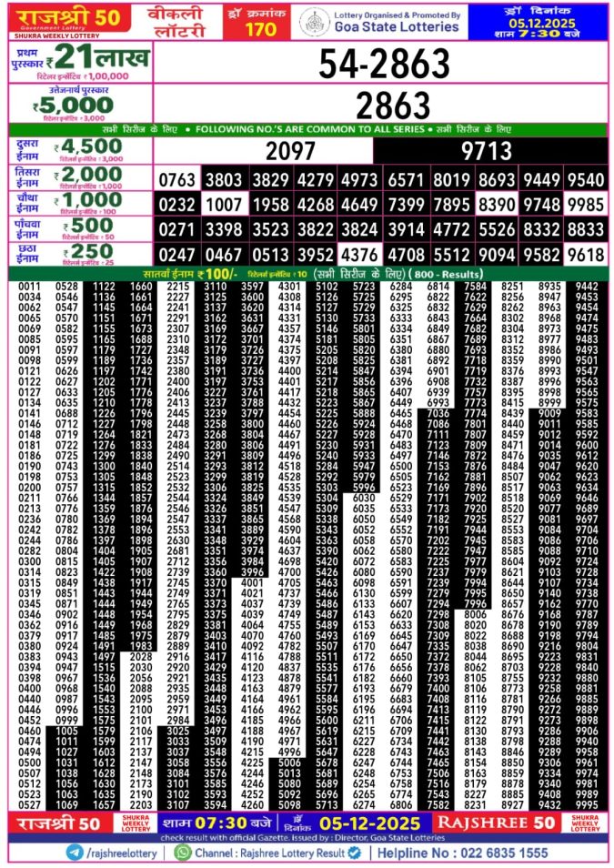 Rajshree 50 Guru Weekly Lottery 7:30 PM Result 05.12.2025