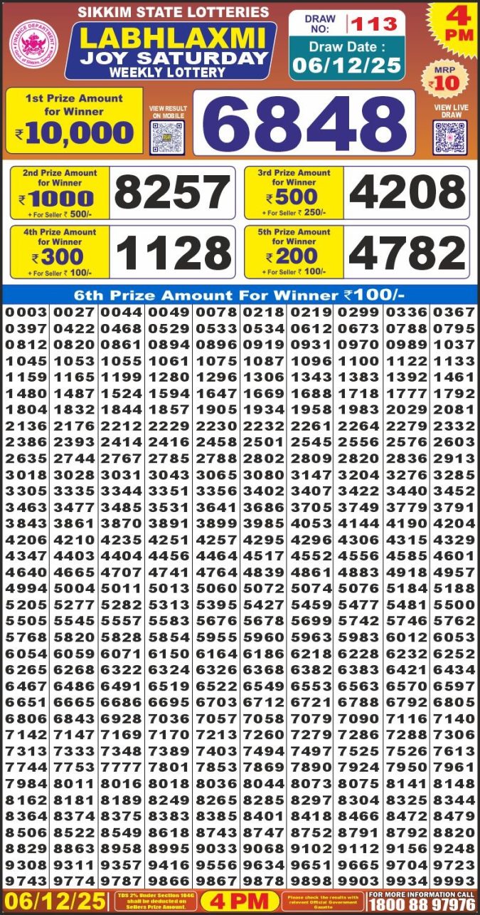 Labh Laxmi Joy Saturday Weekly Lottery 4 PM Result 06.12.2025