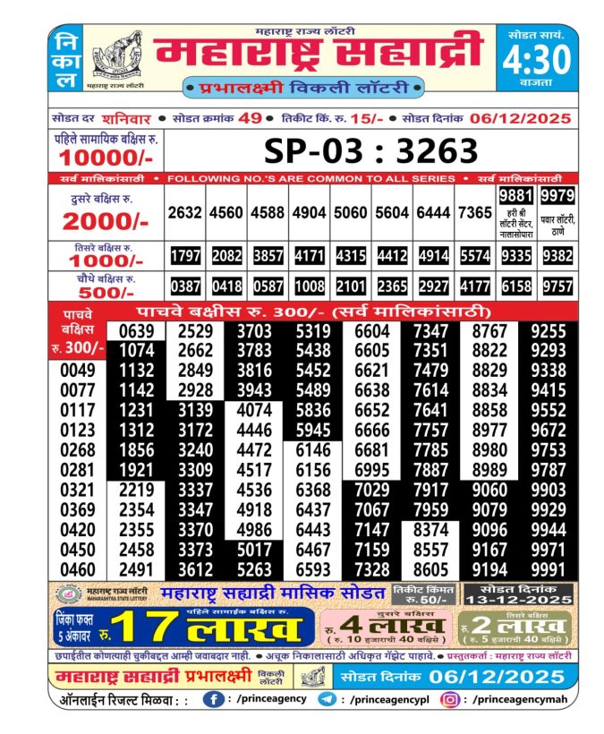Maharashtra Sahyadri Weekly Lottery  Result 06.12.2025