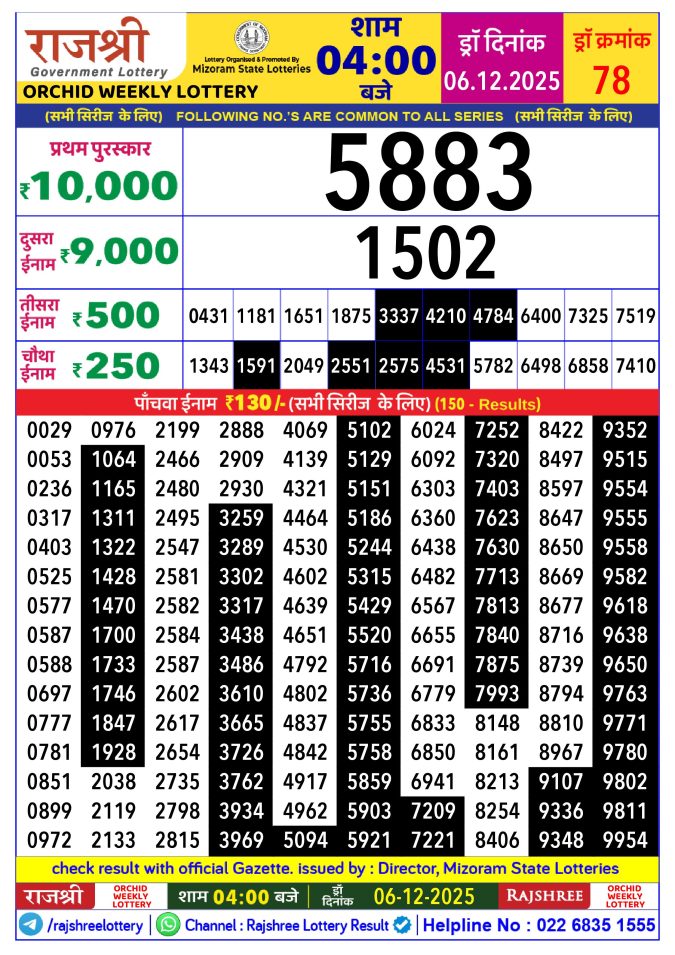 Rajshree orchid Weekly Lottery 4 PM Result 06.12.2025