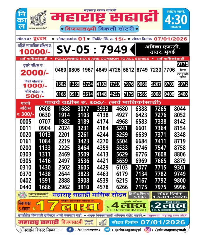 Maharashtra Sahyadri Weekly Lottery Result 07.01.2026
