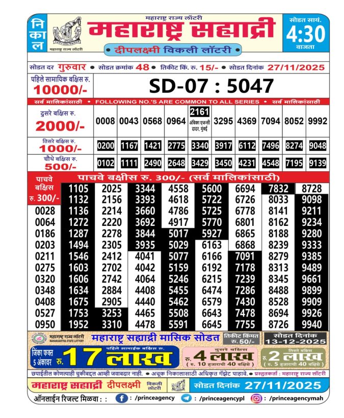 Maharashtra Sahyadri Weekly Lottery  Result 27.11.2025