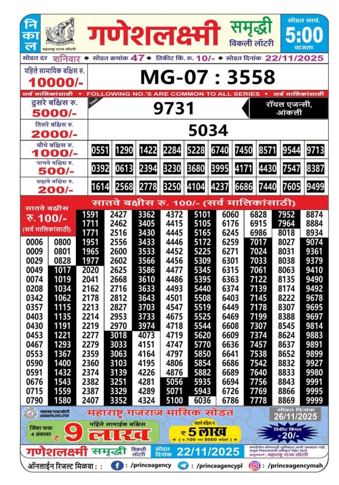 Maharashtra Ganeshlaxmi Weekly Lottery Result, 5pm, 22.11.2025