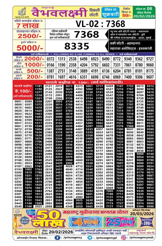 Maharashtra Vaibhav Laxmi lottery Result 20.02.2026