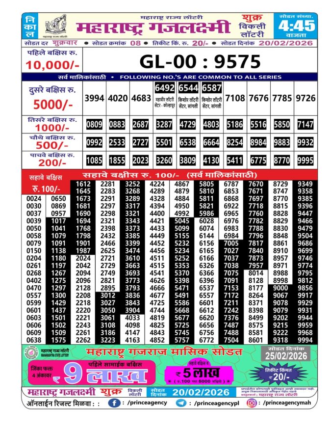 Maharashtra Gajlaxmi Lottery Result 20.02.2026
