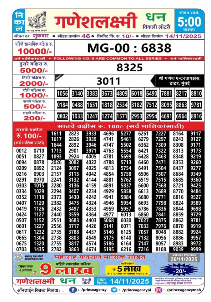 Maharashtra Ganeshlaxmi Weekly Lottery 5PM Result 14.11.2025