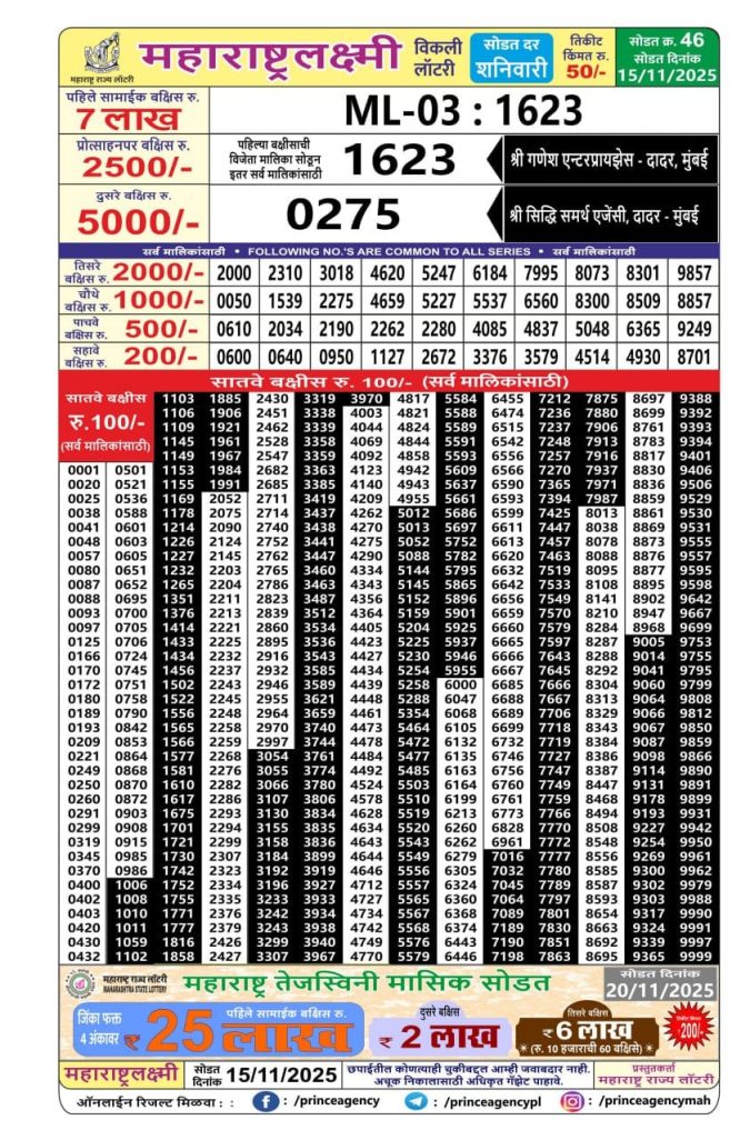 Maharashtra laxmi 4.15PM Weekly Lottery Result 15.11.2025