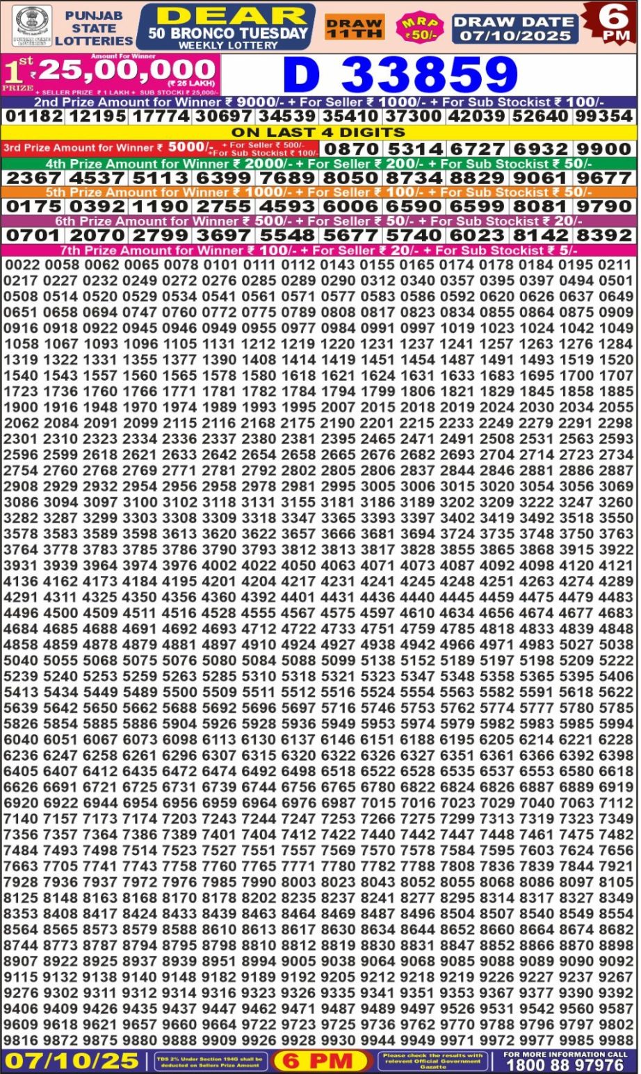 Punjab State Dear 50 Bronco Tuesday Weekly Lottery 6 pm Result 07.10.2025 October 7, 2025 Leave a Comment on Punjab State Dear 50 Bronco Tuesday Weekly Lottery 6 pm Result 07.10.2025 Share: XFacebookPinterestRedditVKDiggLinkedinMix Related Articles 0 20 Dear Seagull Friday Weekly Lottery 8 PM Result 31.10.2025 0 25 Rajshree 10 Evening Weekly Lottery 5:40 PM Result 25.10.2025 0 21 Rajshree 10 Evening Weekly Lottery 5:40 PM Result 17.10.2025 0 58 Rajshree Sunflower Weekly Lottery 4 PM Result 10.08.2025